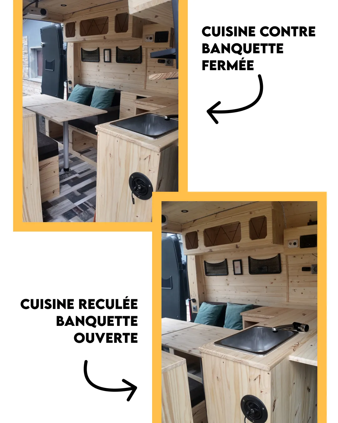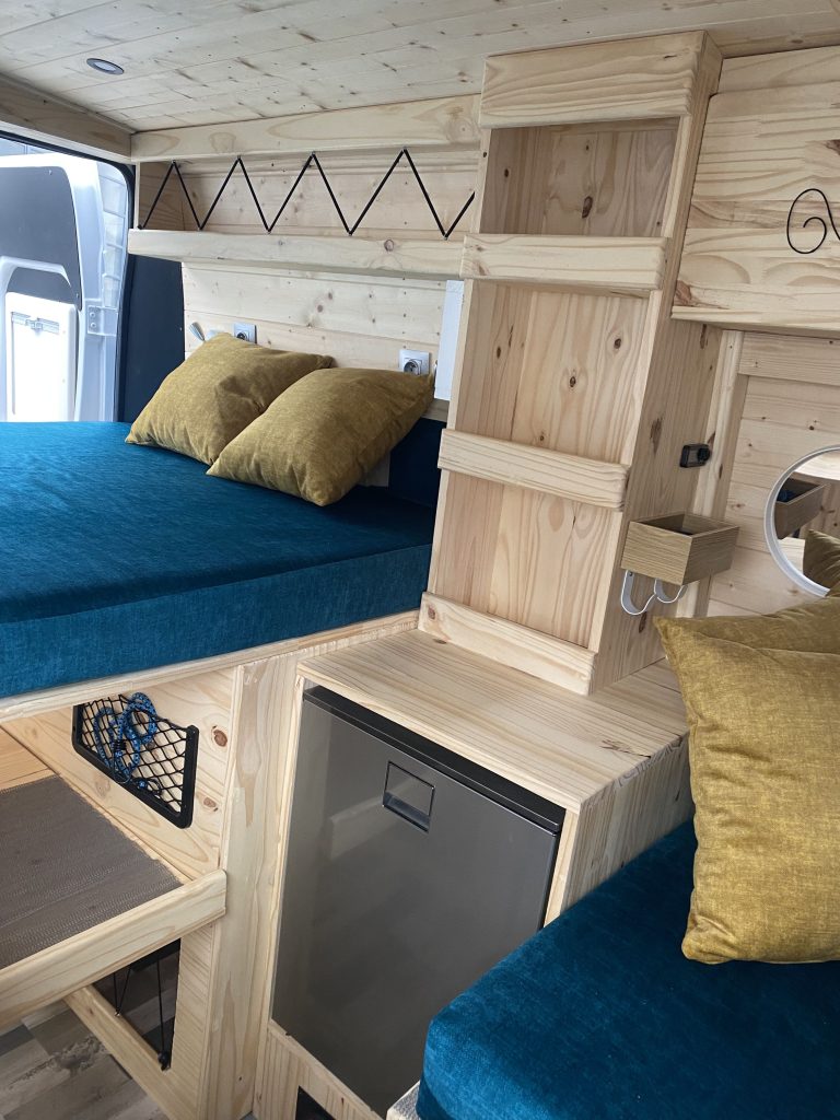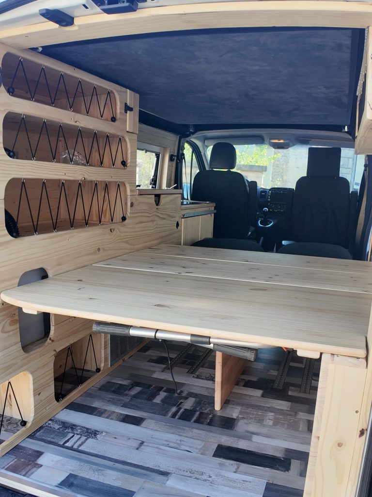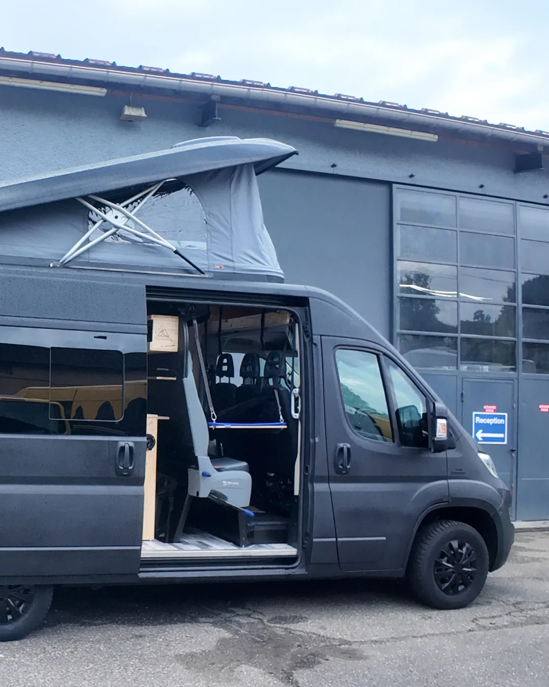 Équipé d’un toit relevable, nous pouvons être debout dedans tout en gardant une petite hauteur pour la route. Ce toit permet d’ajouter 2 couchages en plus !