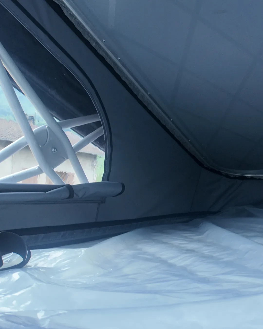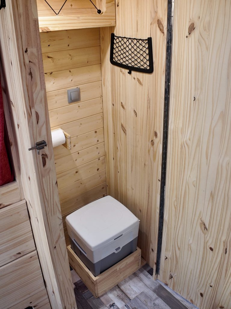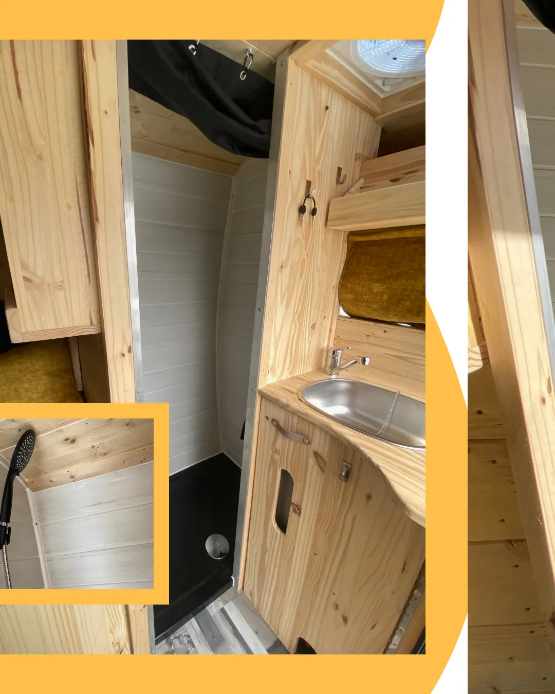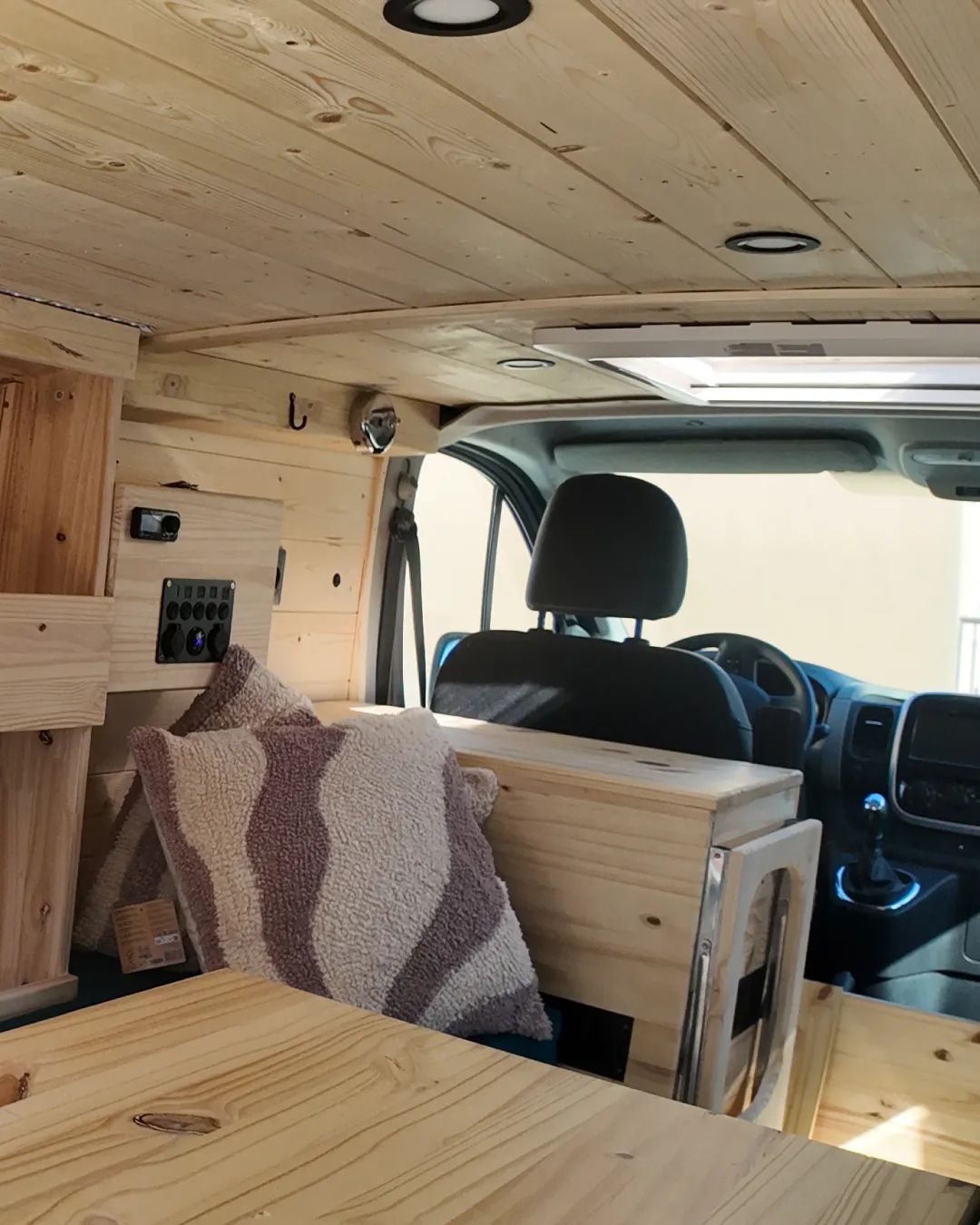 Équipé d’un toit relevable, nous pouvons être debout dedans tout en gardant une petite hauteur pour la route. Ce toit permet d’ajouter 2 couchages en plus !
