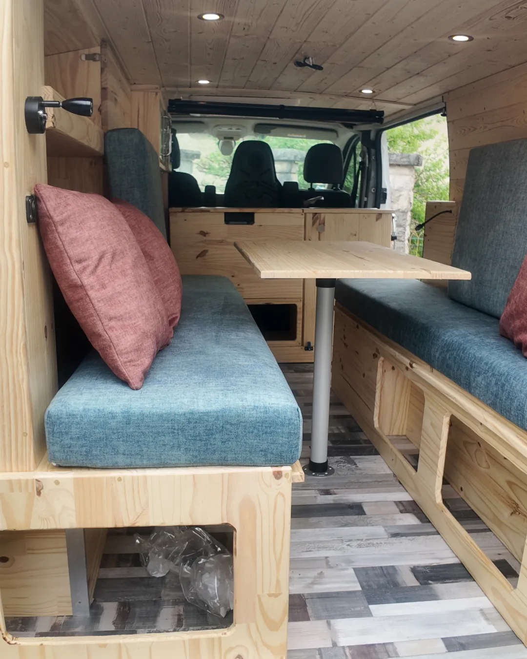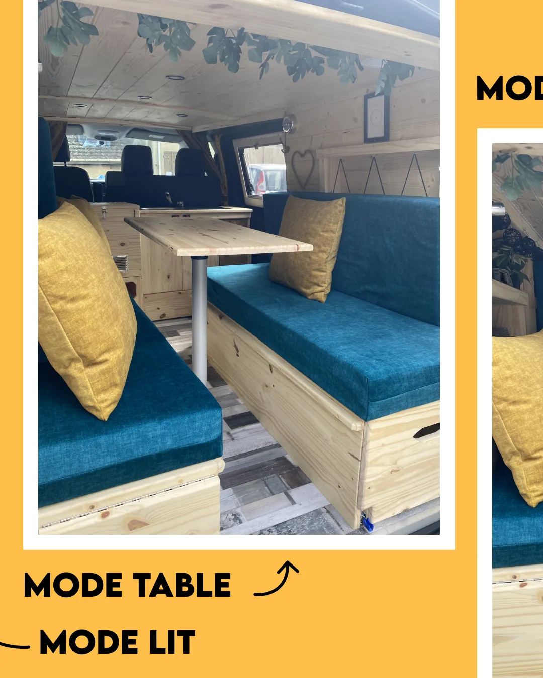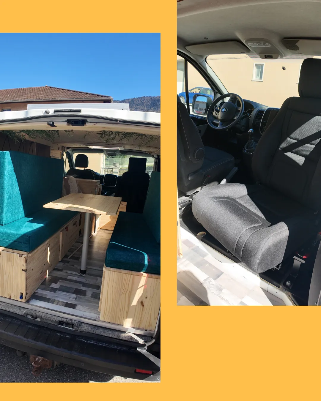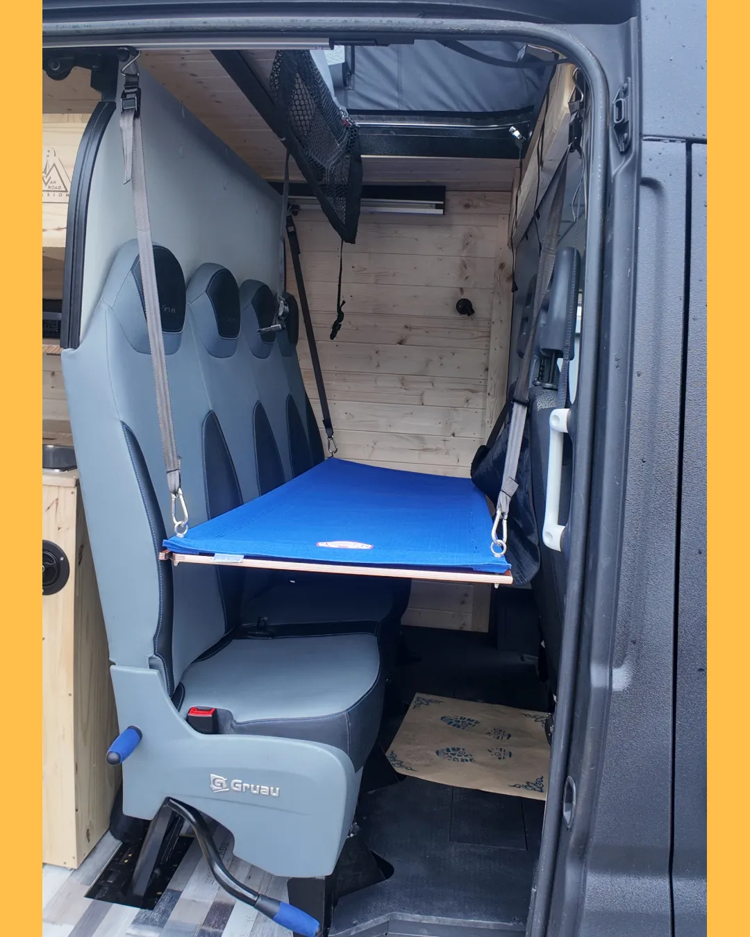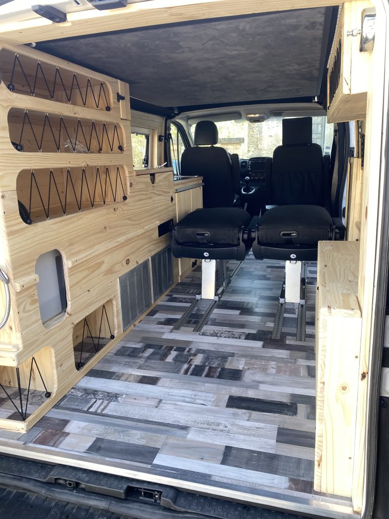 Nous lui avons également rajouté 2 sièges sur rails qui s’avancent et se plient pour pouvoir mettre en place le lit double.