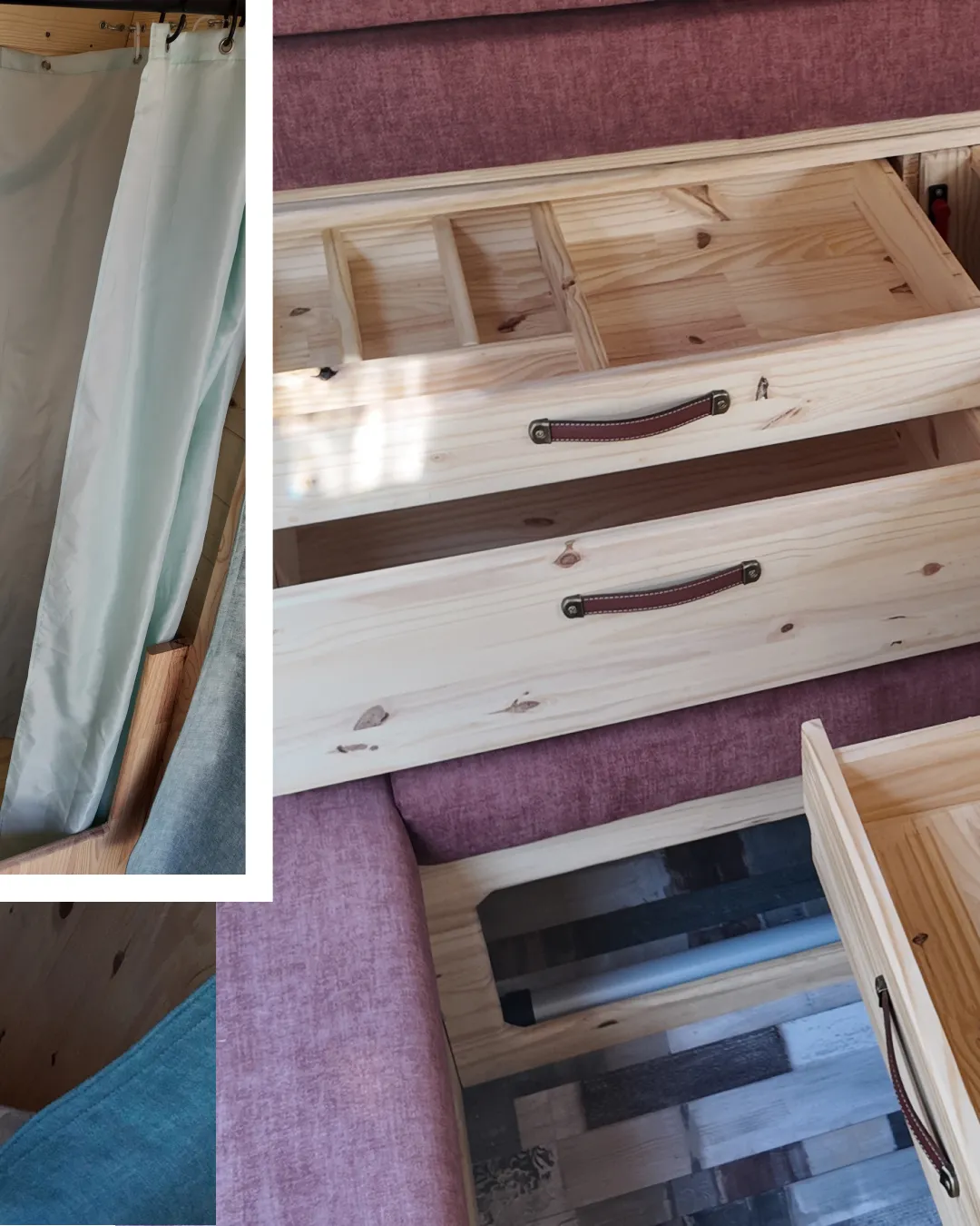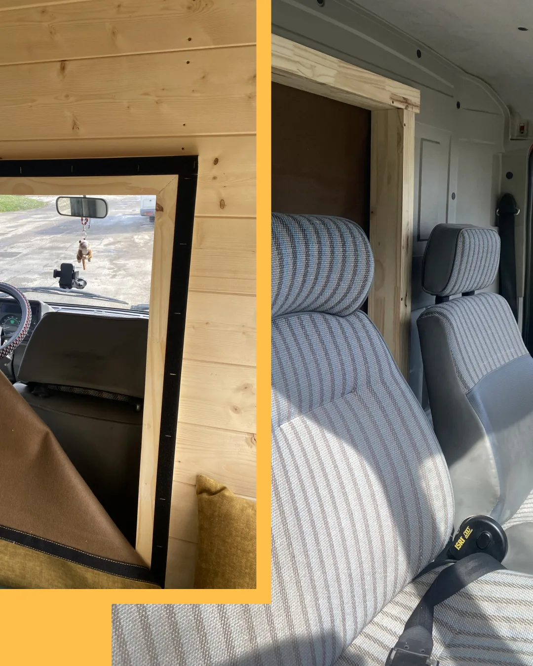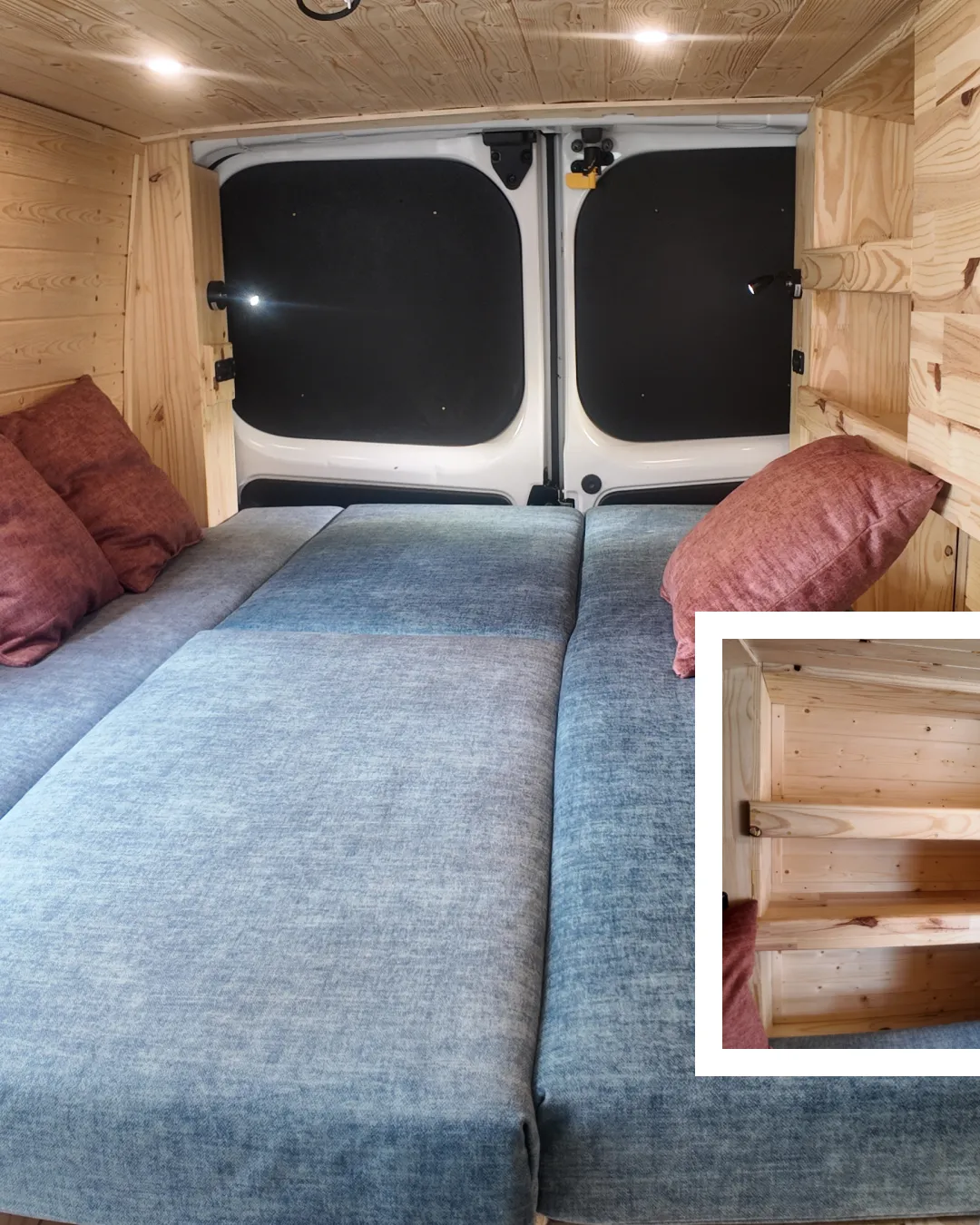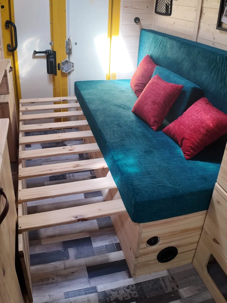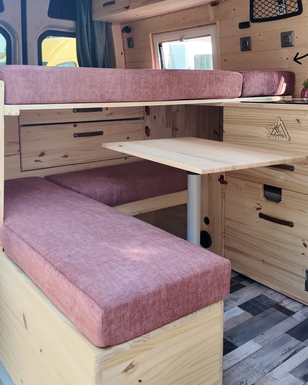 Nous lui avons également rajouté 2 sièges sur rails qui s’avancent et se plient pour pouvoir mettre en place le lit double.