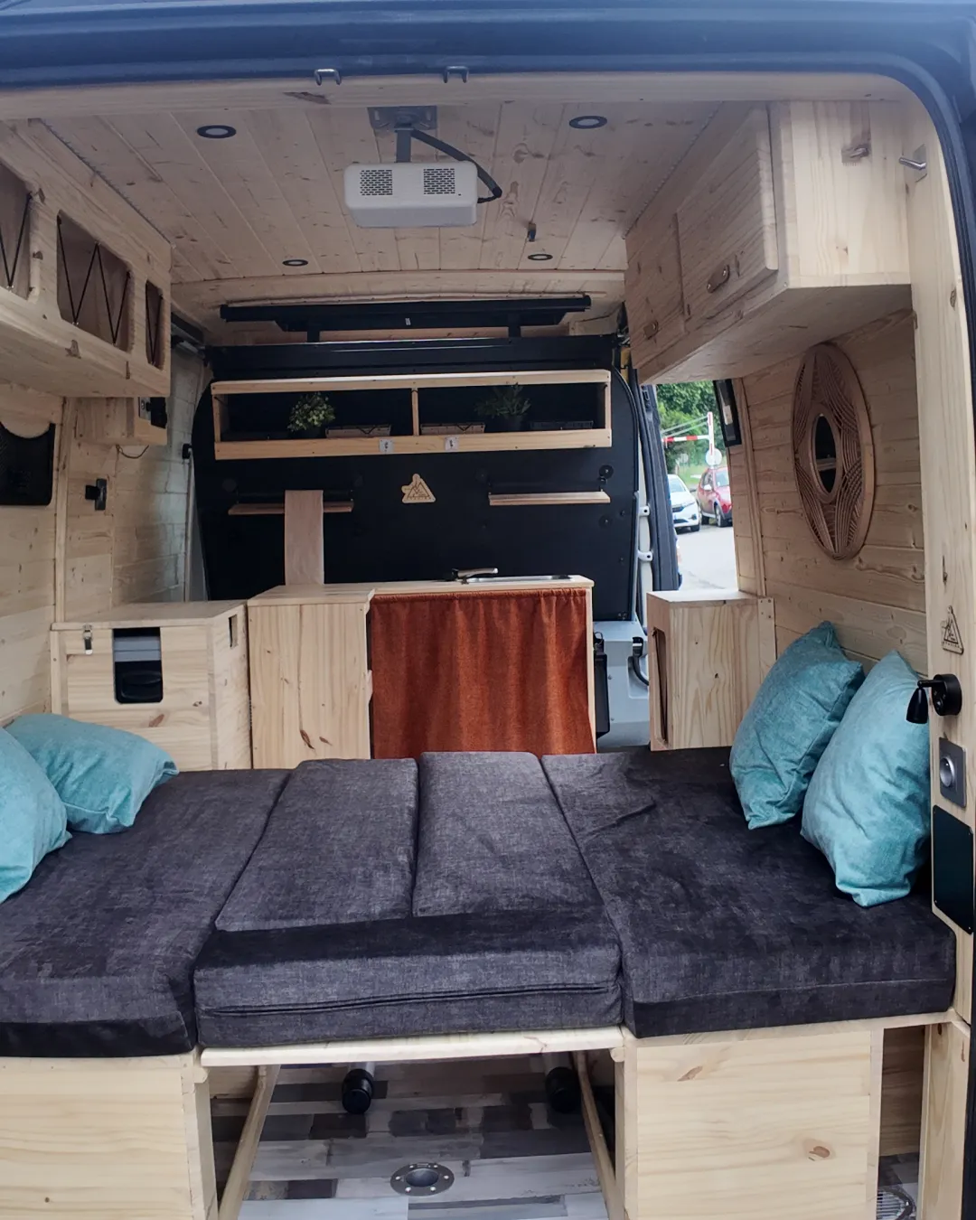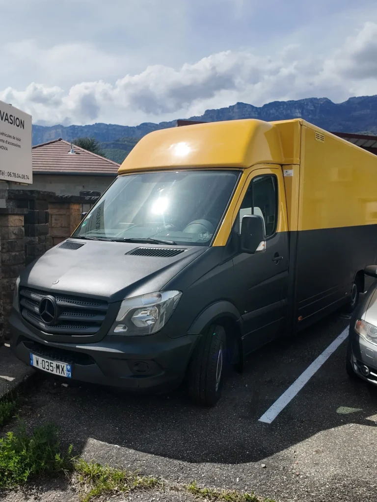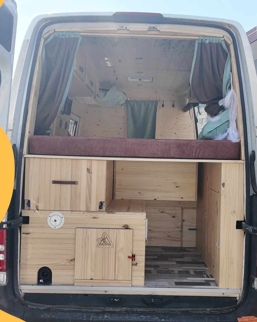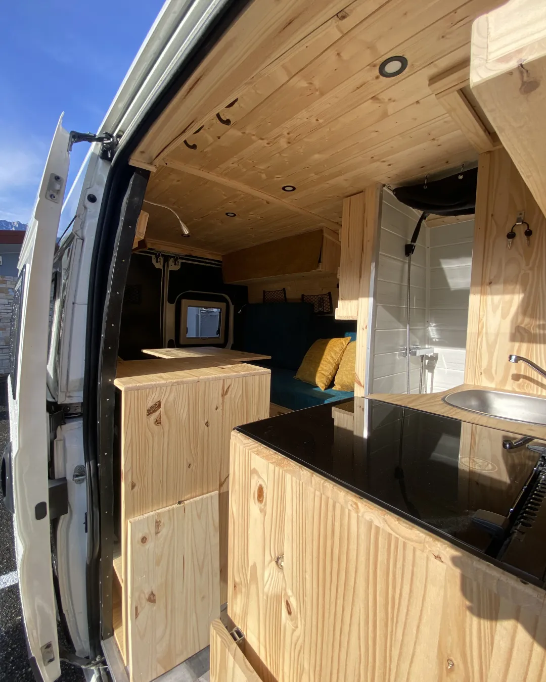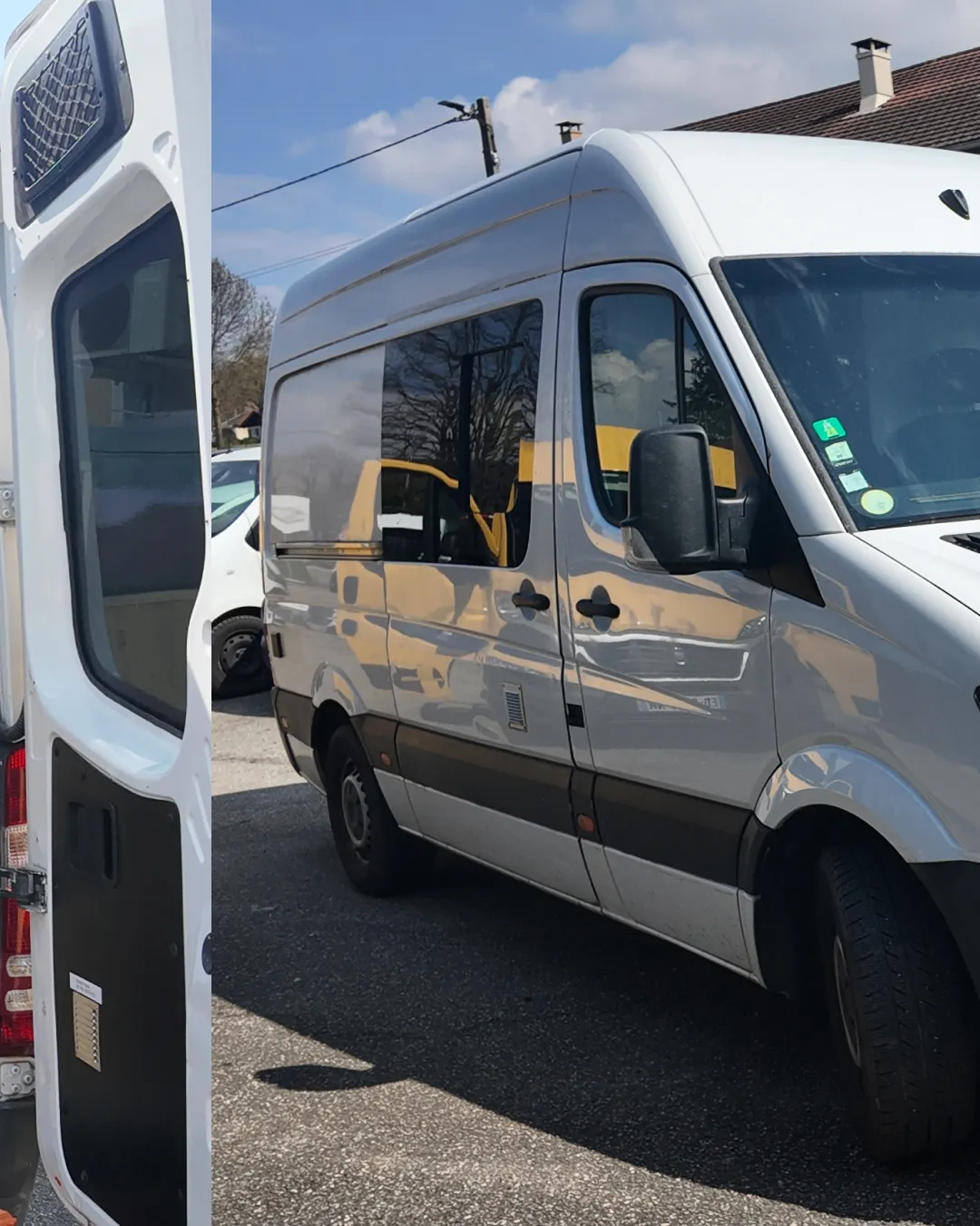 Un grand Mercedes Sprinter H3L5 totalement aménagé pour deux personnes.