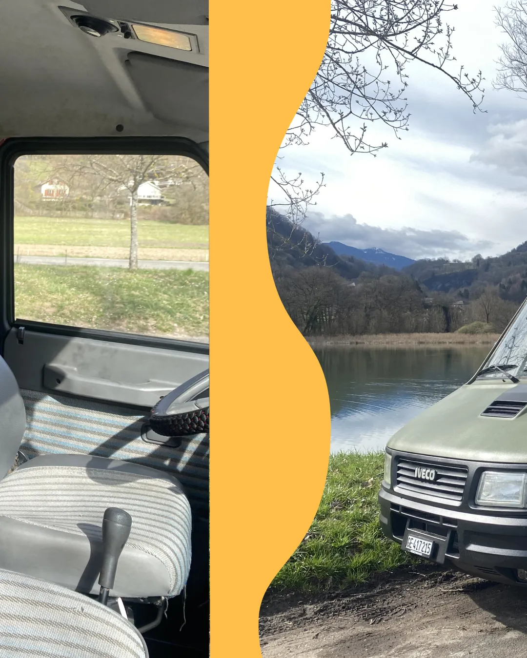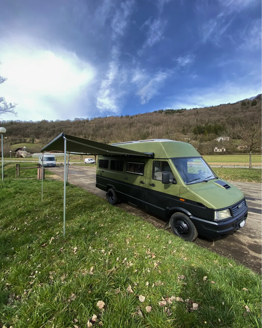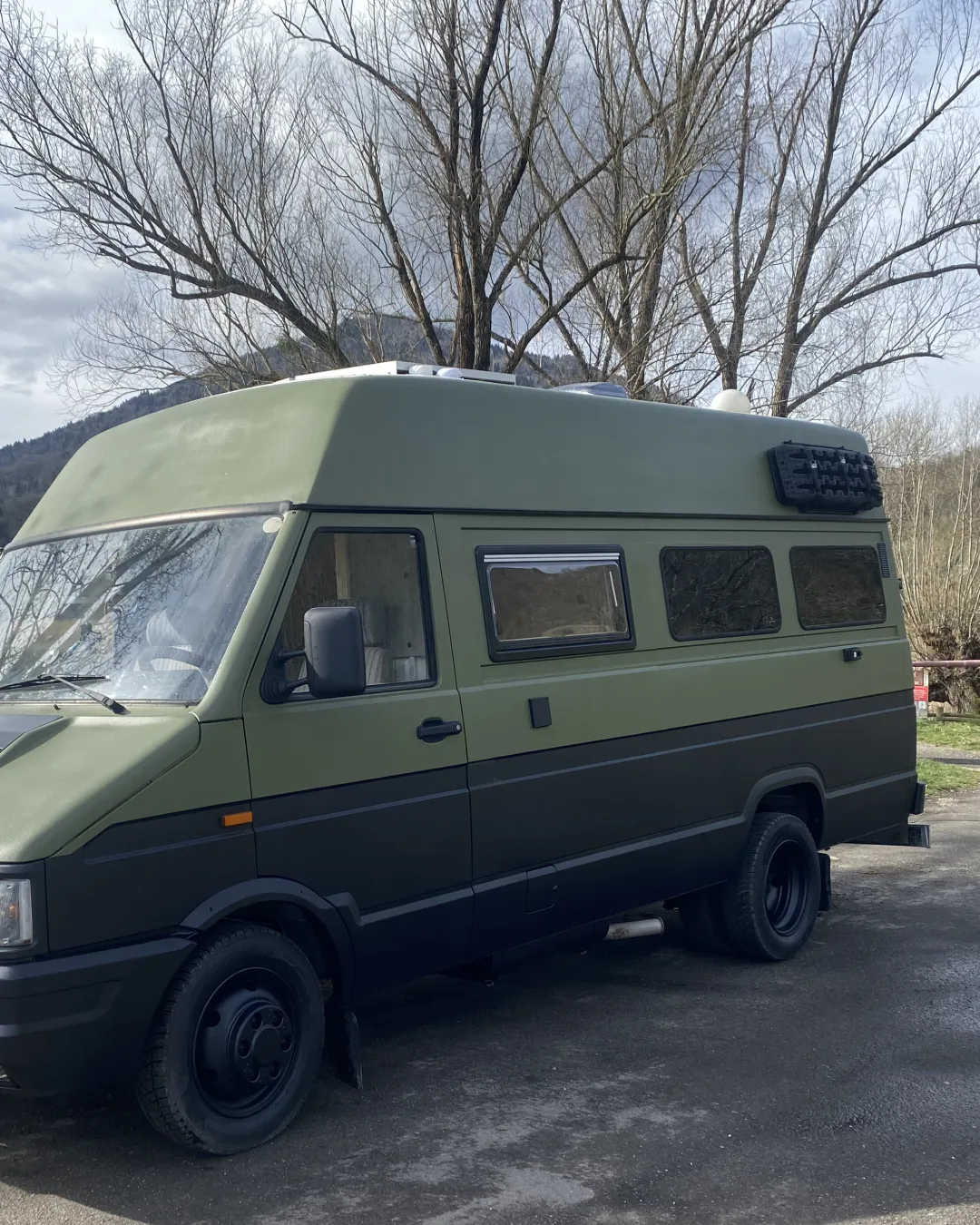 Un grand Iveco Daily des années 90, aménagé pour 2 personnes à 3 personnes (3 sièges, 1 lit double, 1 banquette).