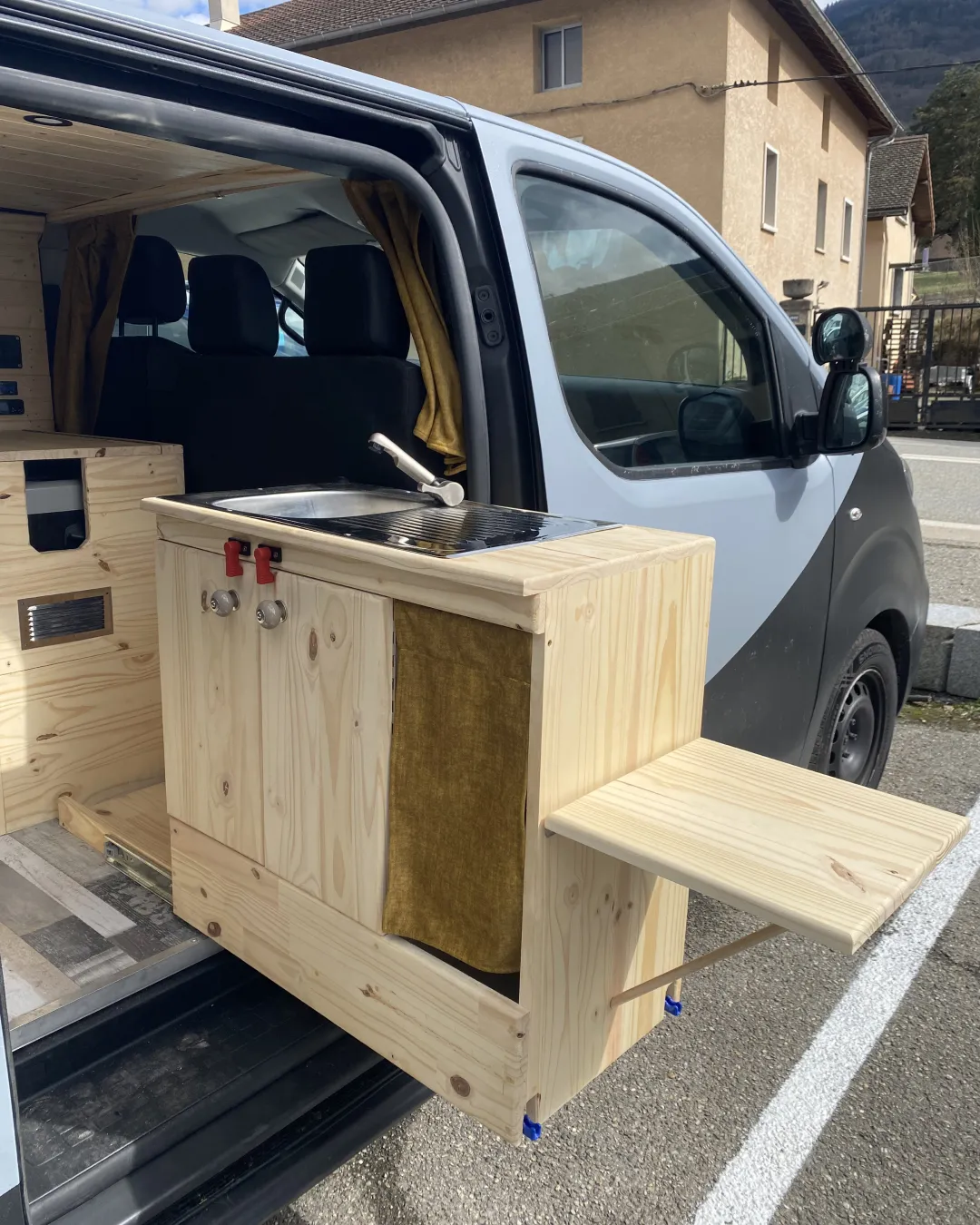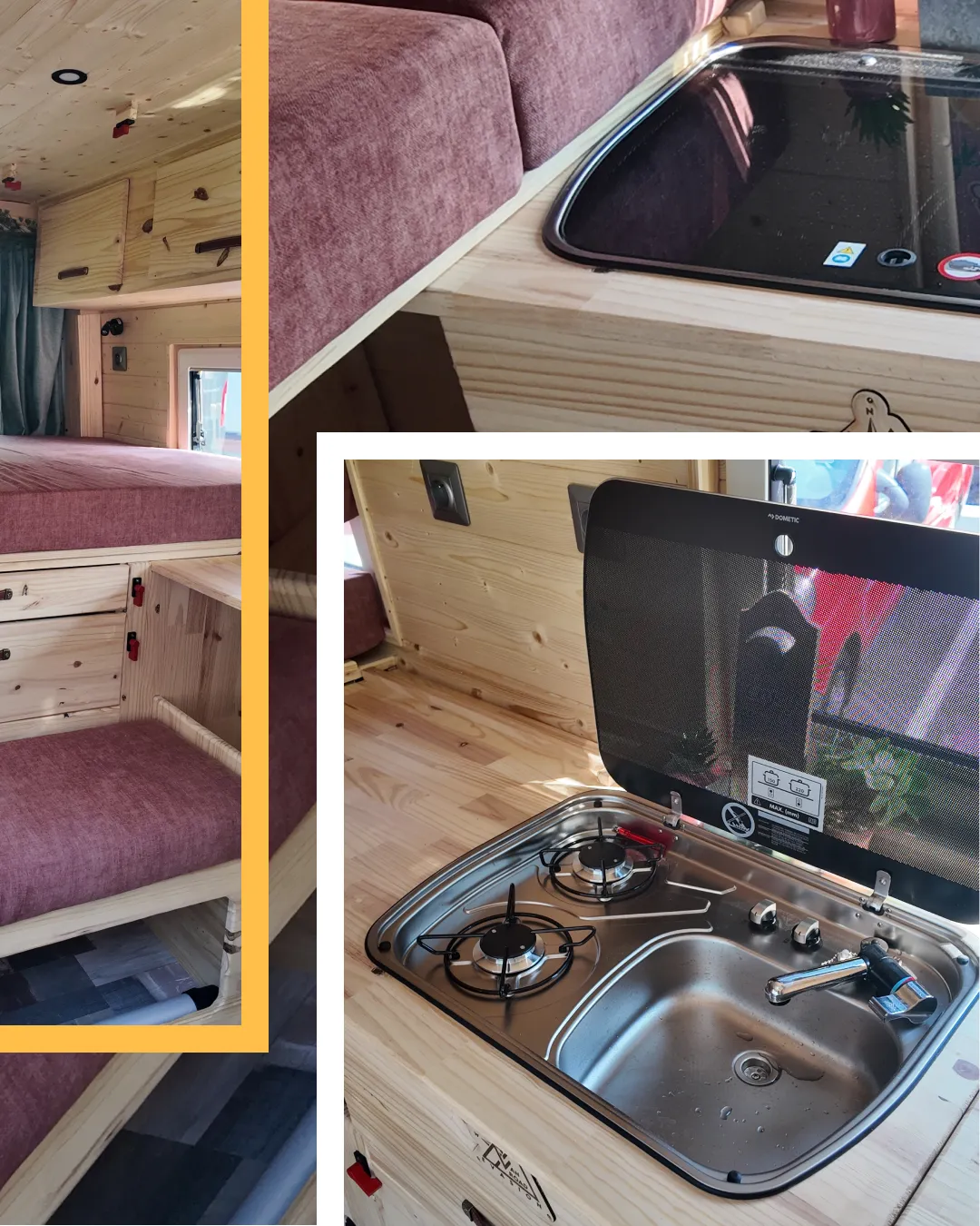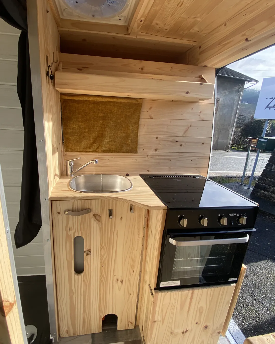 Ce trafic a été aménagé spécialement pour leur chien : la cuisine a été modifiée pour pouvoir installer le panier de leur toutou !