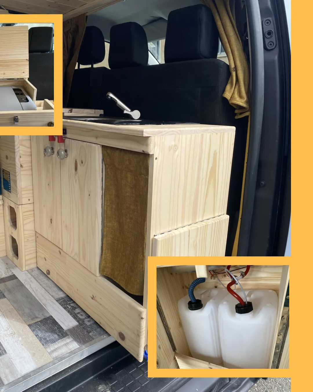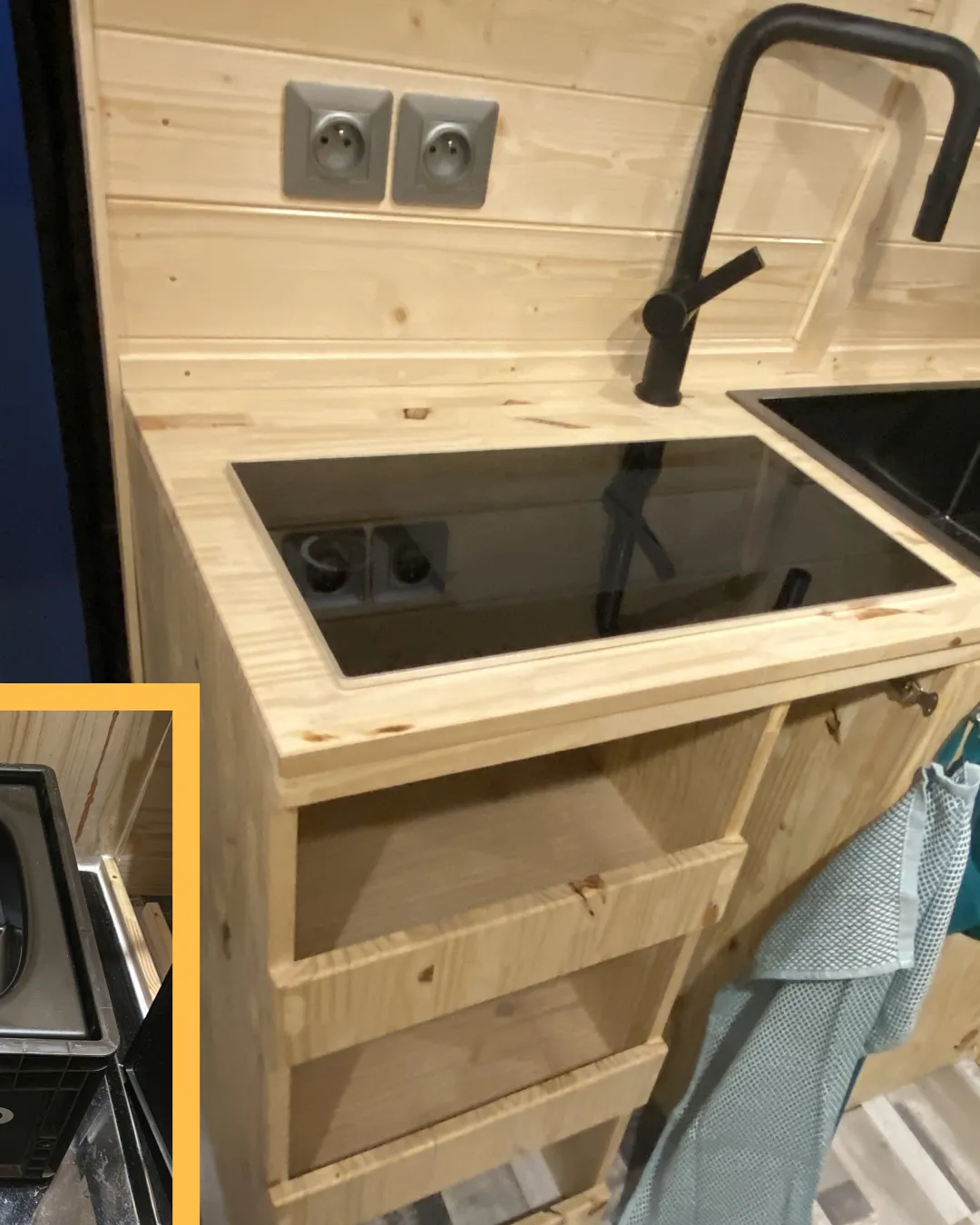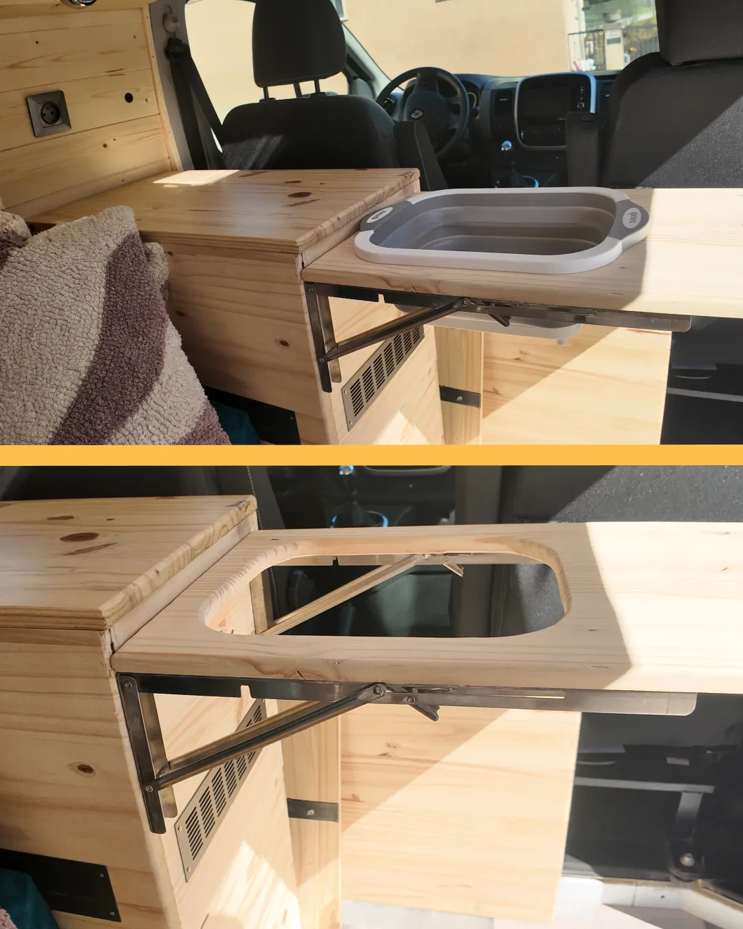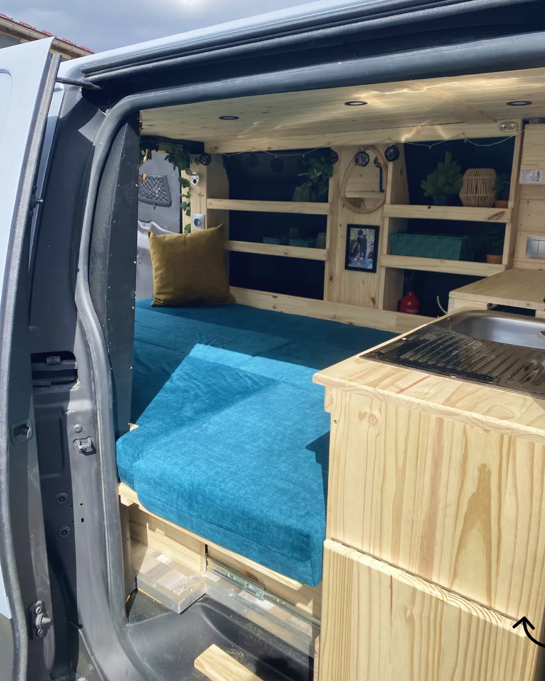 Ce trafic a été aménagé spécialement pour leur chien : la cuisine a été modifiée pour pouvoir installer le panier de leur toutou !