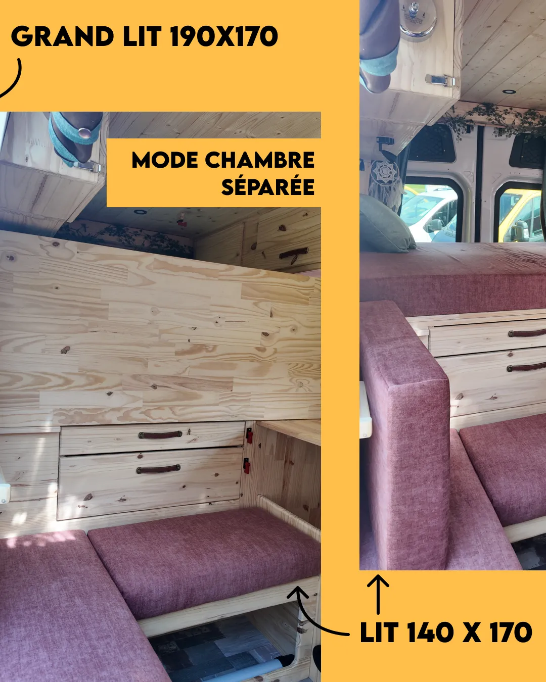 Ce sprinter L2H2 permet d'accueillir 2 personnes. Très complet et spacieux, il a une petite particularité qui fait tout son charme… Une "chambre séparée" !