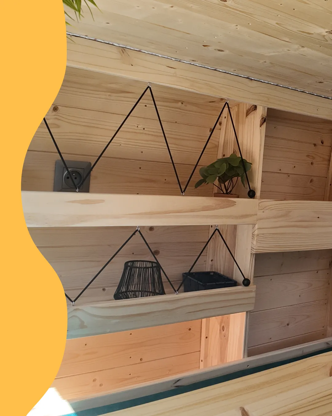 Une des planches du lit fait également office de table d’extérieur avec 2 petites chaises de camping ramenées par notre client.